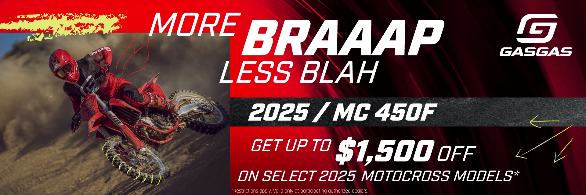 As low as 4.99% APR for up to 60 months on select new, untitled and unregistered select 2024 GASGAS Motorcycles off-road and street model motorcycles 2024 GASGAS offroad GASGAS TXT Racing (250 / 300), TXT GP (250 / 300), MC-E (3 / 5), MC (50 / 65 / 85 (17/14 & 85 19/16) / 125 / 250 / 250F / 250F FACTORY EDITION / 350F / 450F / 450F FACTORY EDITION), EX (250 / 300 / 250F / 350F / 450F), EC (250 / 300 / 450F), EW 500, ES (350 / 500 / 700) and SM 700. Monthly payments required. An Annual Percentage Rate (APR) of 4.99% will apply for a total term of 60 months. Example 1: A total 60-month term with an Amount Financed of $10,000 requires monthly payments of $188.67. APR of 4.99%. Program minimum amount financed is $2,500 and 0% - 15% down payment may be required. Rate and down payment based on credit approval criteria. Offer is subject to credit approval by Synchrony Bank. Offer valid October 20, 2025, through December 31, 2025, and is subject to credit approval by Synchrony Bank. This offer cannot be combined with any other offers. Please see your authorized GASGAS dealer for all program details.